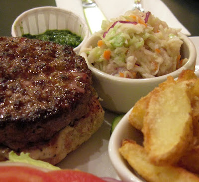 The hamburgers were supposed to be hand-made patties, but they were so regular they looked like they were made in a burger press. At five ounces it's slightly more than a quarter pound burger, but the difference is negligible. The basic burger comes on a dairy-free potato bun and with lettuce, tomato, red onion, "home-made" pickles, special sauce and a side of coleslaw. When I ate there you could order a side of "not-fries" for $2, but I notice the online menu shows the price as $2.50. The "not-fries" are baked fries, and are better than the average baked fry.
